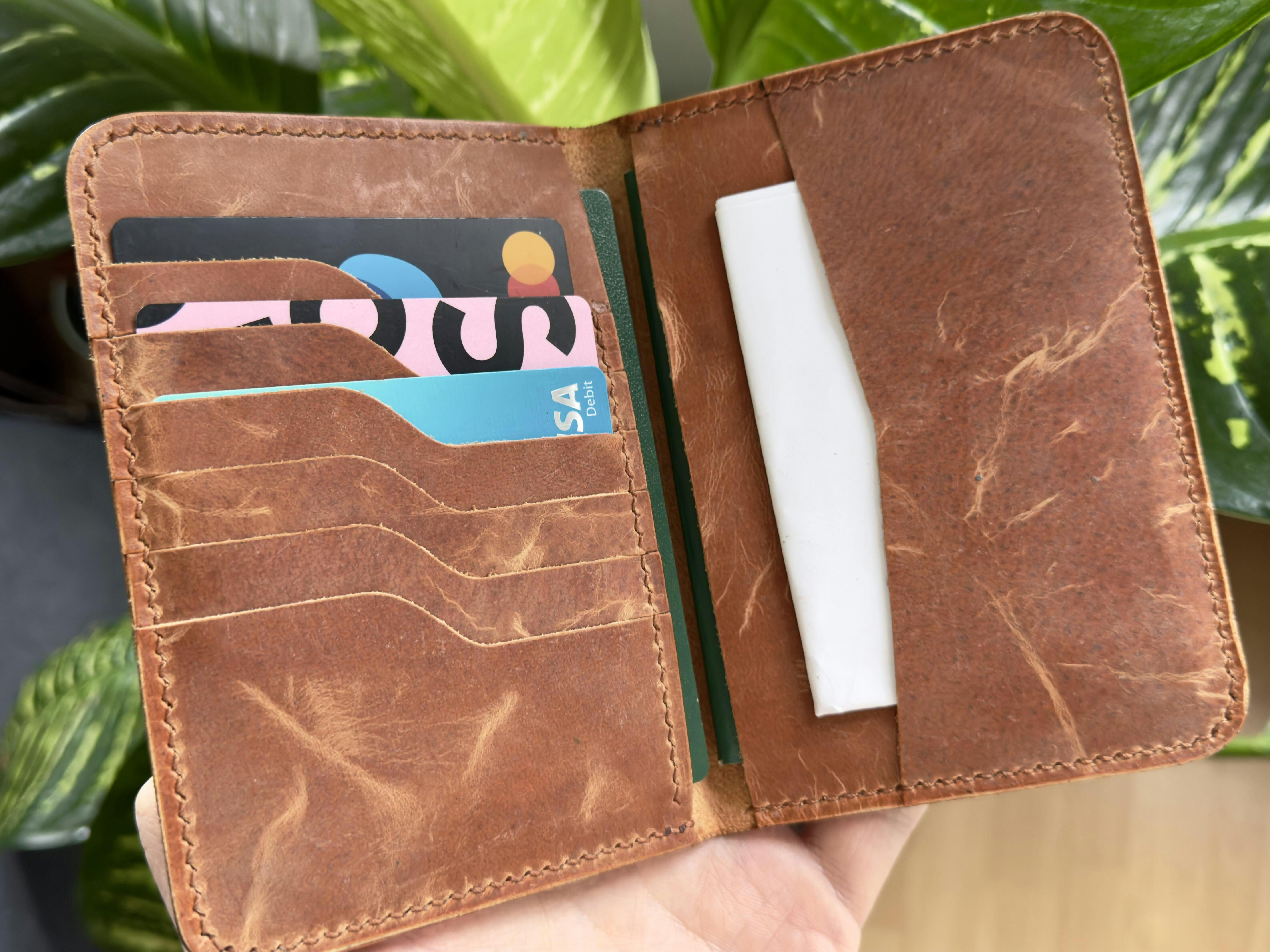 Each piece is cut by hand and saddle-stitched using tear-resistant Vinymo MBT thread. The edges are burnished smooth and sealed with our signature natural wax balm for durability and touch.